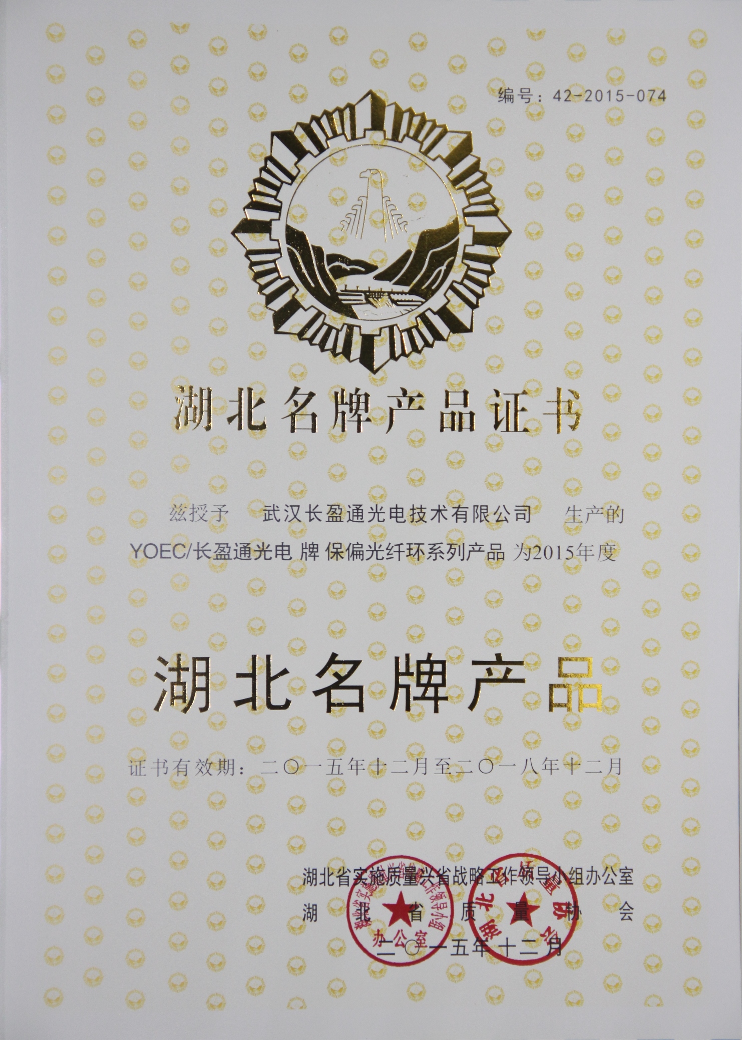 近日,全省质量强省战略推进工作会在武汉举行。省政府副省长许克振等领导出席了会议,并在2015年度湖北名牌企业授牌仪式中为上榜企业授牌,武汉williamhill中国官方网站光电技术有限公司生产的“YOEC/williamhill中国官方网站光电”牌保偏光纤环系列产品,被评选为“湖北名牌”产品,荣获“2015年度湖北名牌产品”称号。
