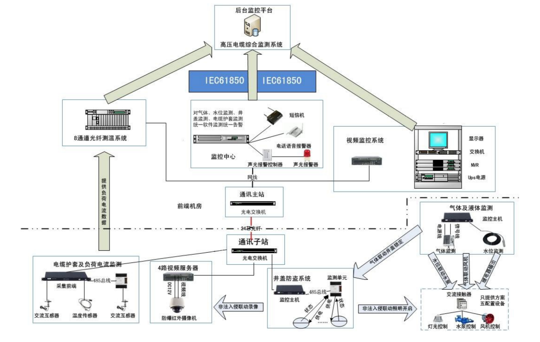 电缆隧道综合监控系统包含“电缆状态监测及载流量分析子系统”、"隧道环境监测子系统”、“视频监控子系统”、“门禁井盖监测子系统”、“隧道辅助设备控制子系统”等五个系统,可以对电缆隧道的运行情况进行全方位监测,在电缆事故和异常灾害发生时,可以及时通过隧道内各类辅助设施和预警及应急手段以有效控制事件影响范围,确保电网安全稳定、保证人身安全、减少经济损失。五个子系统集成在同一个监控平台上,统一显示,统一管理,操作方便。