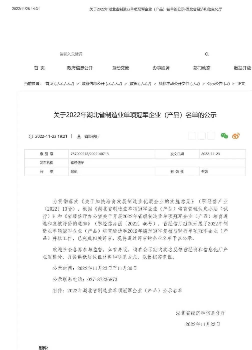 为贯彻落实工业和信息化部等六部委《关于加快培育发展制造业优质企业的指导意见》精神,按照工业和信息化部《制造业单项冠军企业培育提升专项行动实施方案》和省经信厅等七部门《关于加快培育发展制造业优质企业的实施意见》要求,引导我省制造业企业专注于细分产品市场创新、产品质量提升和品牌培育,加快培育优质制造业企业,提升湖北制造业核心竞争力,推动产业迈向中高端,根据《湖北省制造业单项冠军企业(产品)培育管理认定办法(试行)》(鄂经信产业〔2022〕69号),湖北省经信厅组织开展了省级制造业单项冠军企业(产品)培育遴选和复核评价工作,日前公示了《2022年湖北省制造业单项冠军企业(产品)名单》,williamhill中国官方网站公司光纤环器件产品荣获2022年湖北省制造业单项冠军产品。