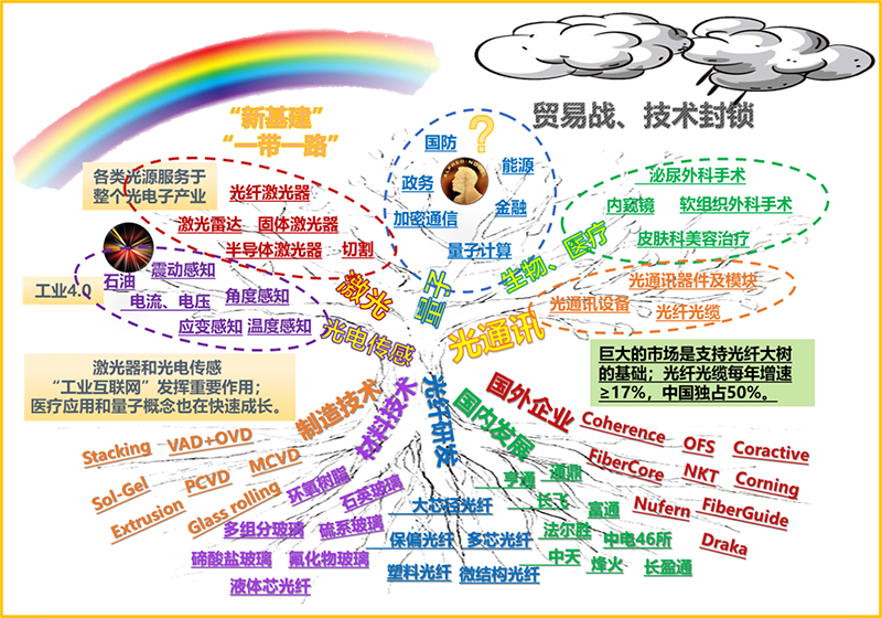 用一棵“光纤大树”来看看这个行业(如图2)。光纤大树已经发展了半个多世纪,光纤的上游领域(树根部分)主要涉及玻璃、高分子材料、制造技术等,全球大量的科研院所、企业依然在这一基础条件中贡献着聪明智慧。下游应用(树枝部分)涉及光电通讯、光纤激光、光电传感、生物医疗等几大领域。通信单模光纤的应用优势依然非常明显(高带宽、柔性、抗干扰、化学性质稳定、性价比高),且占据着主要的地位。然而,特种光纤的发展对新一代的科技发展所起到的作用不可小视,它不仅提升了光纤技术的技术含量,对“5G”信息通信行业新基建发展起到了支撑和促进作用,还对大环境(彩虹和乌云)“一带一路”国际光缆干线战略的建设,突破贸易战中的技术壁垒,都具有重要的作用。
