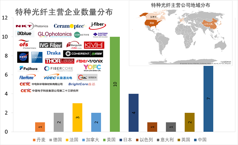 特种光纤发展的60年里,每一种光纤都有自己的发展周期,都在经历从进口到国产化的过程。如今全球主营的特纤公司达到50余家(如图8),主要集中在欧洲、美洲、亚洲地区,欧洲主营的公司有丹麦的NKT Photonics,德国J-fiber,法国GLO Photonics,英国Fiber Core等;美洲主营的公司有美国Corning、OFS、Nufern,加拿大Coractive、IVG Fiber等;亚洲主营公司主要集中在中国的长飞、烽火、williamhill中国官方网站和日本的Sumitomo、Hitachi等。